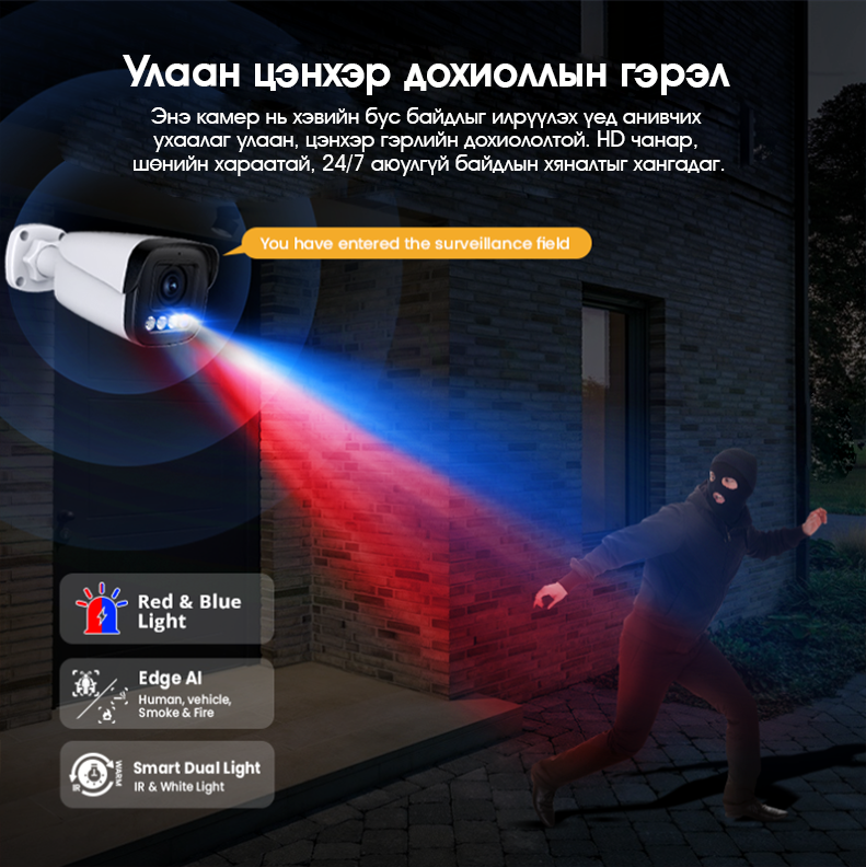 Улаан-цэнхэр дохиололтой 8MP 4K POE ухаалаг хяналтын камер